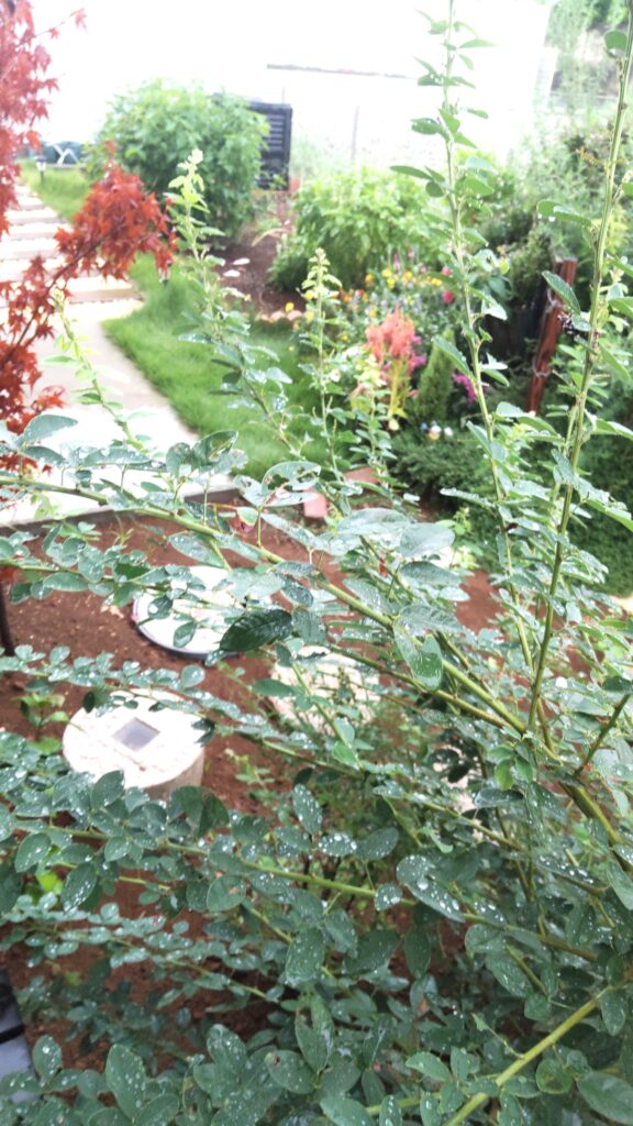 萩の葉っぱはよく水をはじくので、きれいな雨露が輝いています